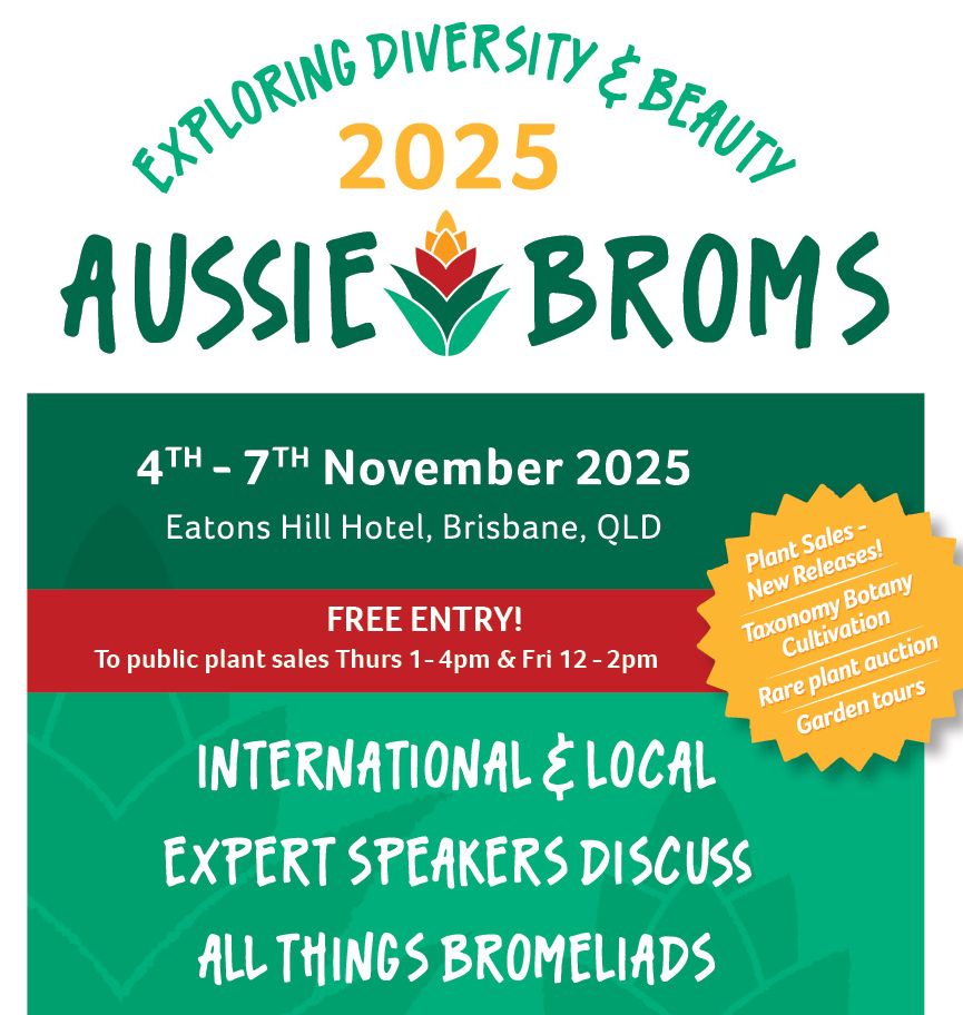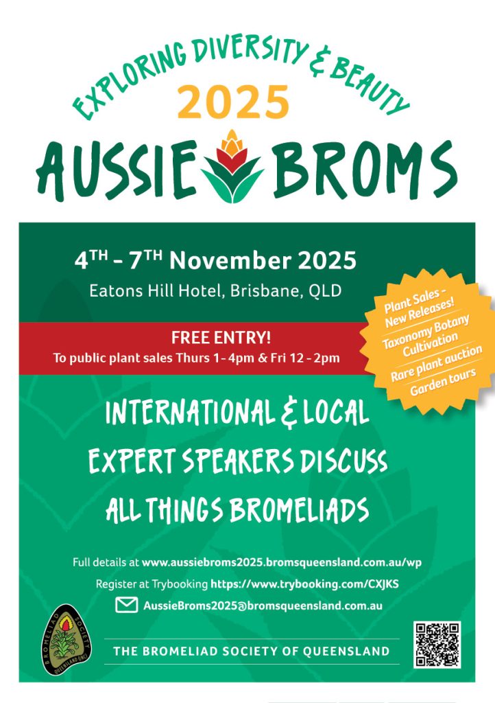Learn More4th to 7th November 2025 Exciting news!!! The 22nd Australasian Bromeliad Conference – Aussie Broms 2025 – has been launched! The theme is ‘Exploring Beauty and Diversity’. The Bromeliad Society of Queensland invites the global bromeliad community to… Read More